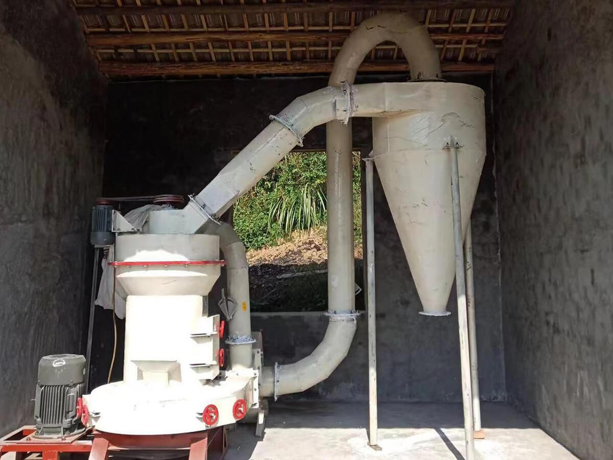 散装物料经颚式破碎机破碎至所需粒度后,由提升机送入储料斗,再由振动给料机连续均匀定量地送入主机研磨室进行研磨。研磨后的粉末由风机气流带走,并经分析仪进行分级。细度较高的粉末随气流经管道进入大型旋风分离器进行分离收集,最终成品粉末从阀门排出。气流经大型旋风分离器上端的回风管道吸入风机。本机整个气流系统为封闭循环式,在正负压条件下循环。